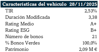 A cierre de noviembre de 2025 el vehículo está invertido en 21 bonos verdes: 14 de emisores públicos y 7 de emisores privados.