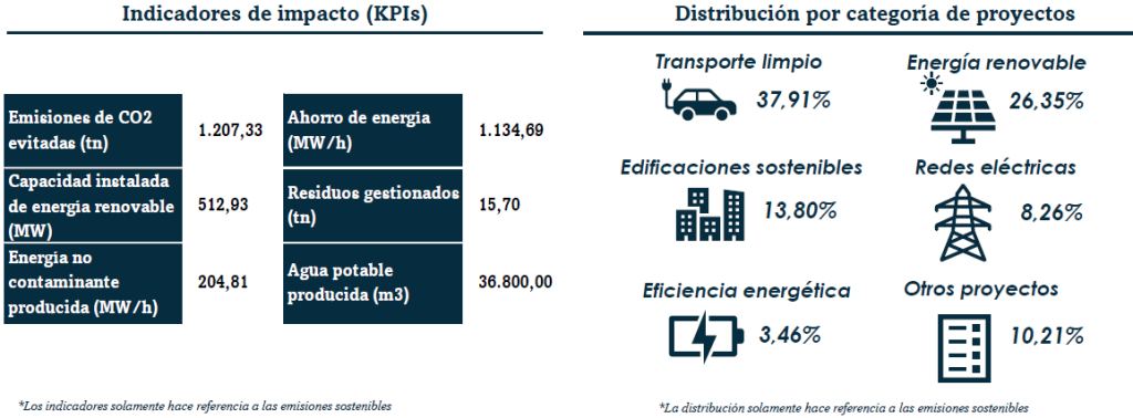 Actualmente la cartera de proyectos está centrada en transporte limpio, energía renovable, redes eléctricas, edificaciones sostenibles o eficiencia energética, entre otros, que contribuyen de manera positiva a la lucha contra el cambio climático. A continuación, se muestran los principales indicadores de contribución climática de la cartera: