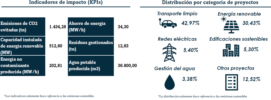 Actualmente la cartera de proyectos está centrada en transporte limpio, energía renovable, redes eléctricas, edificaciones sostenibles o gestión de agua, entre otros, que contribuyen de manera positiva a la lucha contra el cambio climático. A continuación, se muestran los principales indicadores de contribución climática de la cartera: