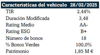 A cierre de febrero de 2025 el vehículo está invertido en 18 bonos verdes: 13 de emisores públicos y 5 de emisores privados.