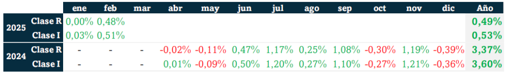 Durante el mes de febrero de 2025, ambas clases han obtenido una rentabilidad positiva de +0,48% (Clase R) y +0,51%% (Clase I), situándose la rentabilidad en lo que va de año 2025 en +0,49% (Clase R) y +0,53% (Clase I).